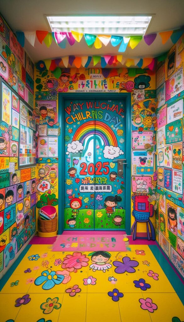 हर क्लासरूम का दरवाज़ा बच्चों के लिए वेलकम ज़ोन की तरह सजाया जा सकता है। Children’s Day 2025 पर “Welcome Little Stars”, “Happy Children’s Day” जैसे बैनर लगाएं। ब्लैकबोर्ड पर कलर चॉक से बच्चों के लिए प्यारे मैसेज या डूडल्स बनाएं। इससे बच्चे खुद को खास महसूस करेंगे।