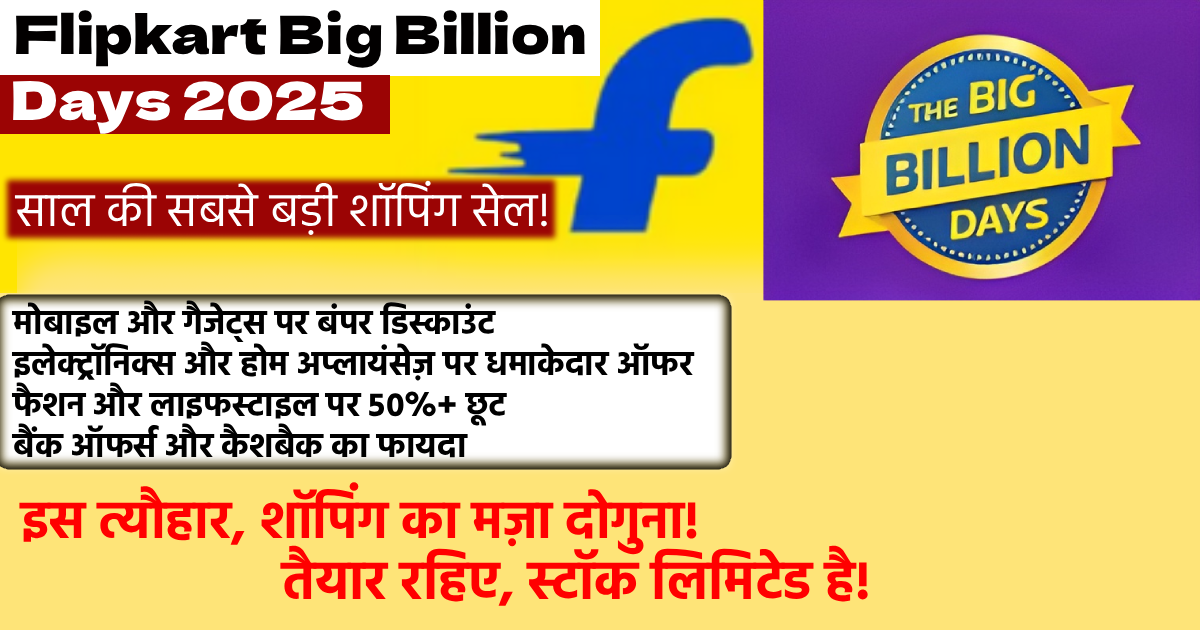 Big Billion Days Sale 2025 भारत में ऑनलाइन शॉपिंग का नाम आते ही फ्लिपकार्ट (Flipkart) की Big Billion Days Sale सबसे पहले याद आती है। हर साल इस सेल का लोग बेसब्री से इंतज़ार करते हैं क्योंकि इसमें लगभग हर कैटेगरी पर जबरदस्त डिस्काउंट और ऑफर्स मिलते हैं। साल 2025 की Big Billion Days Sale को लेकर भी ग्राहकों में उत्साह चरम पर है। अगर आप भी सोच रहे हैं कि यह मेगा सेल कब से कब तक चलेगी और इसमें क्या खास मिलने वाला है, तो यह आर्टिकल आपके लिए है।