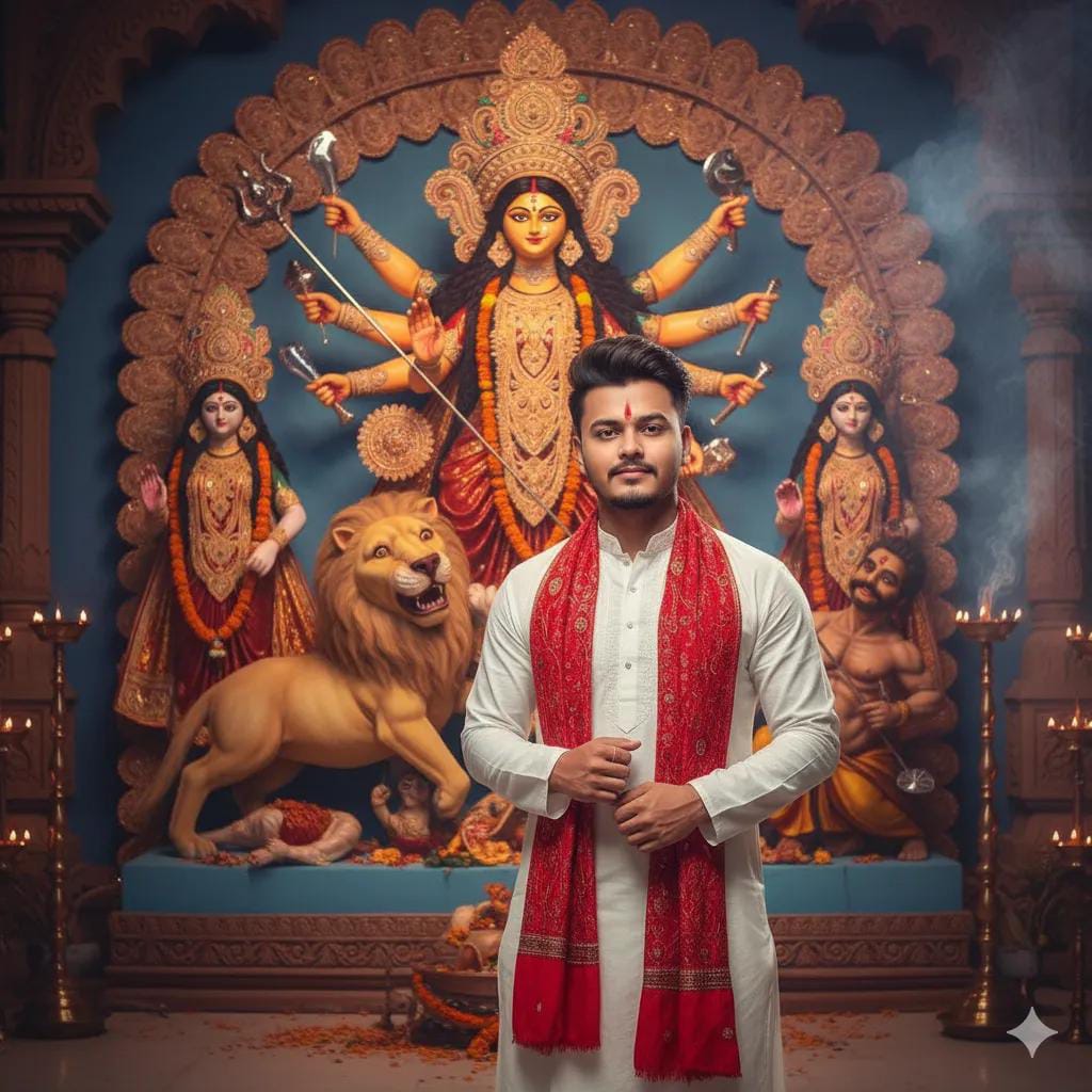 • जैसे: “माता दुर्गा का सुंदर आर्टवर्क, पृष्ठभूमि में मंदिर और सजावट, रंग-बिरंगे पारंपरिक लुक के साथ”