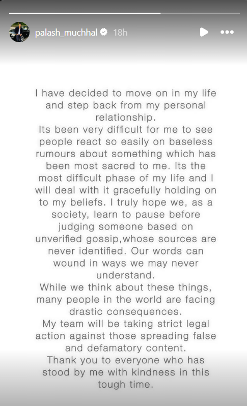 पलाश मुच्छल ने इस पूरे विवाद पर सीधे तौर पर कोई बयान नहीं दिया, लेकिन कहा जा रहा है कि वह अपनी बहन पलीनी मुच्छल की तरह मीडिया के विवादों से दूरी बनाए रखते हैं।